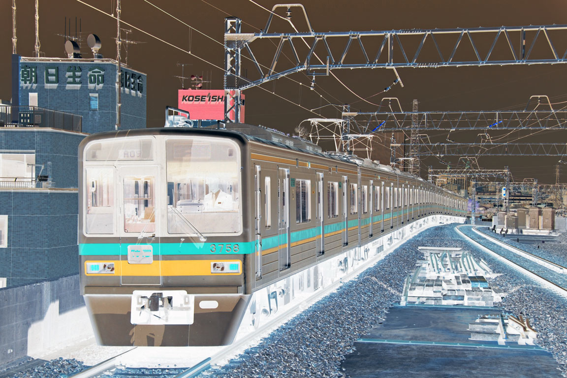 特徴のある上下2層の高架線上を行く、普通から特急まで幅広く活躍している車両です。 この関東の大手私鉄はどれでしょうか? 行先表示は消して、カラーネガのように画像処理をしています。