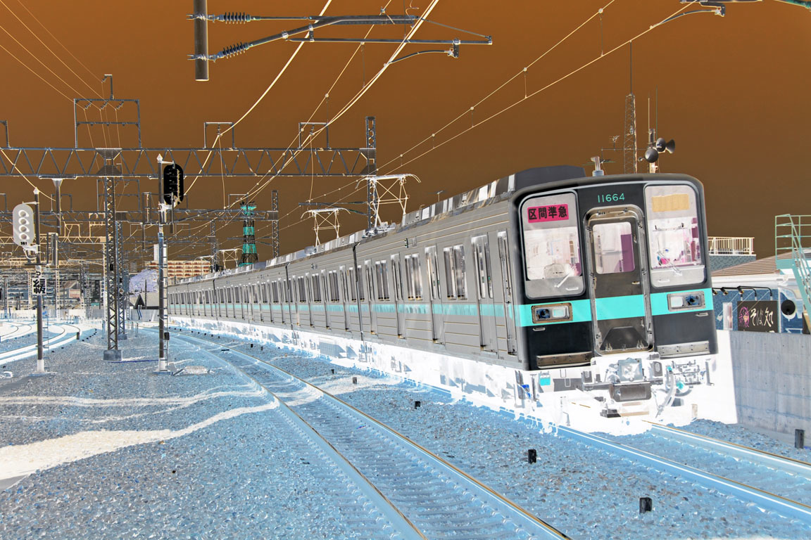 関東ではJR以外で最長の複々線高架線上を行く、代表的な車両です。 この大手私鉄はどれでしょうか? 行先表示は消して、カラーネガのように画像処理をしています。