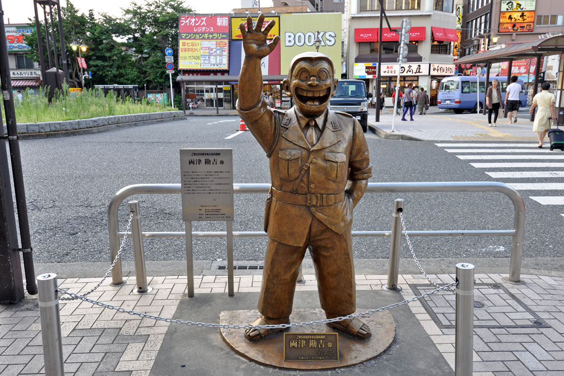 これは、週間少年ジャンプの連載が34年を超えたマンガ、こち亀の主人公、両津勘吉巡査の銅像です。 2006年に建てられたものですが、どこの駅前にあるものでしょうか?