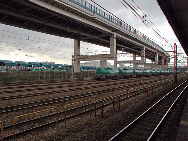 JR根岸線の根岸駅で、石油・ガソリンの専用列車が頻繁に発着します。 左側の石油・ガソリン ターミナル構内に留置できるタンク車は何編成?