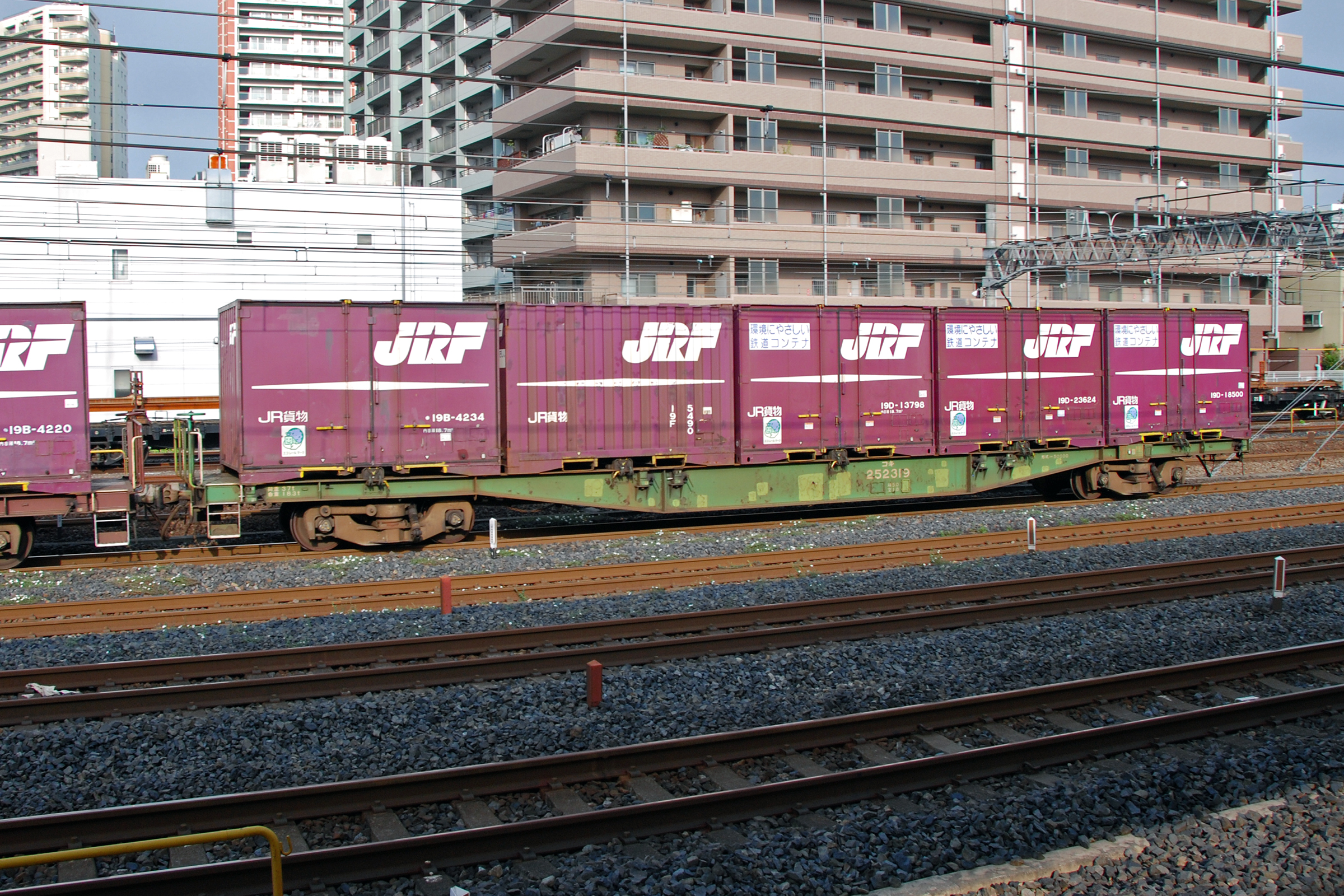 コンテナの大型化への対応はコキ5000(11ft/5tコンテナを4個)からコキ106(31ft/13.8tを2個)に大型化されました。