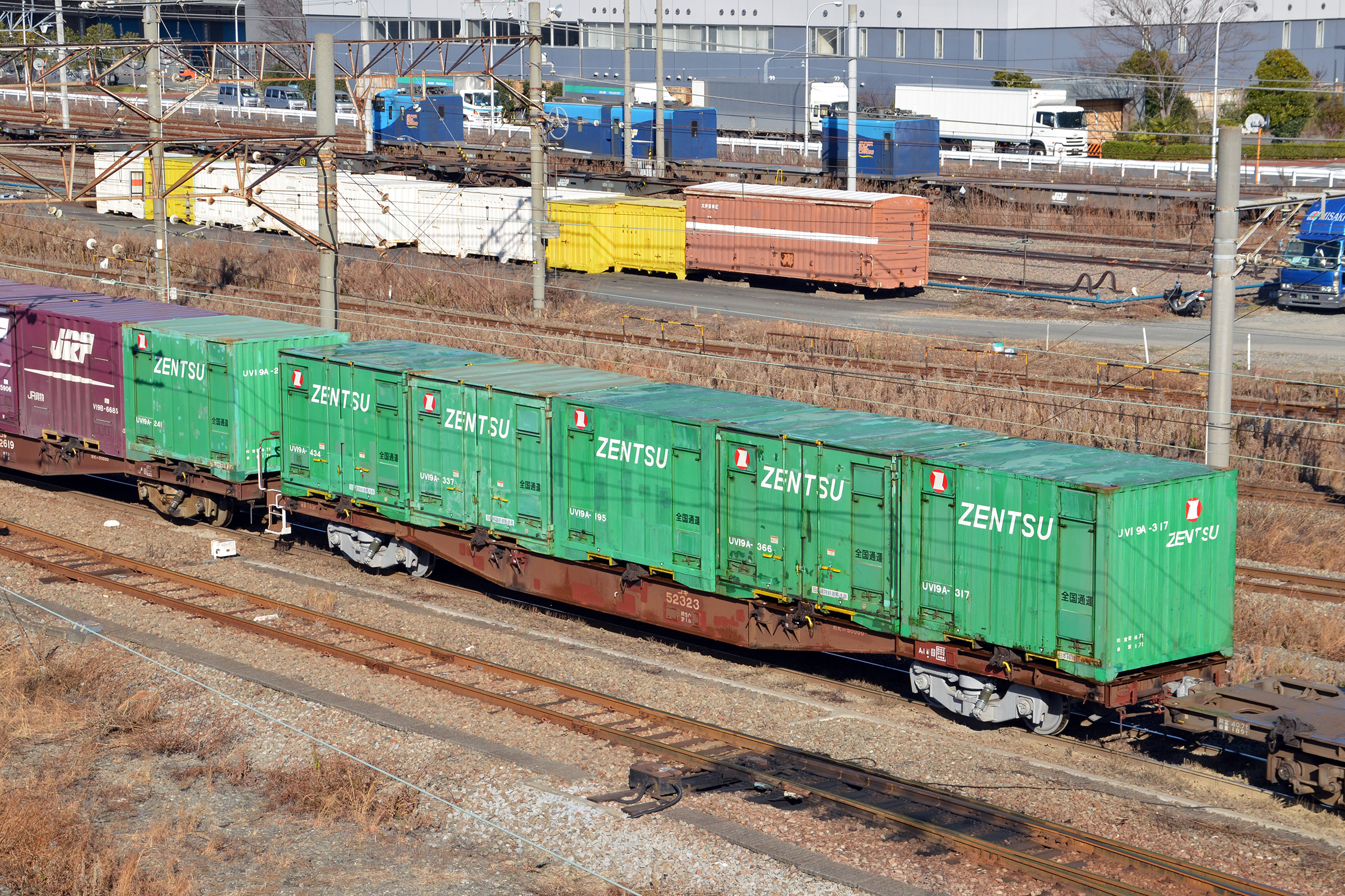 コキ5500は7両目の貨車、コンテナ4個を積載。
