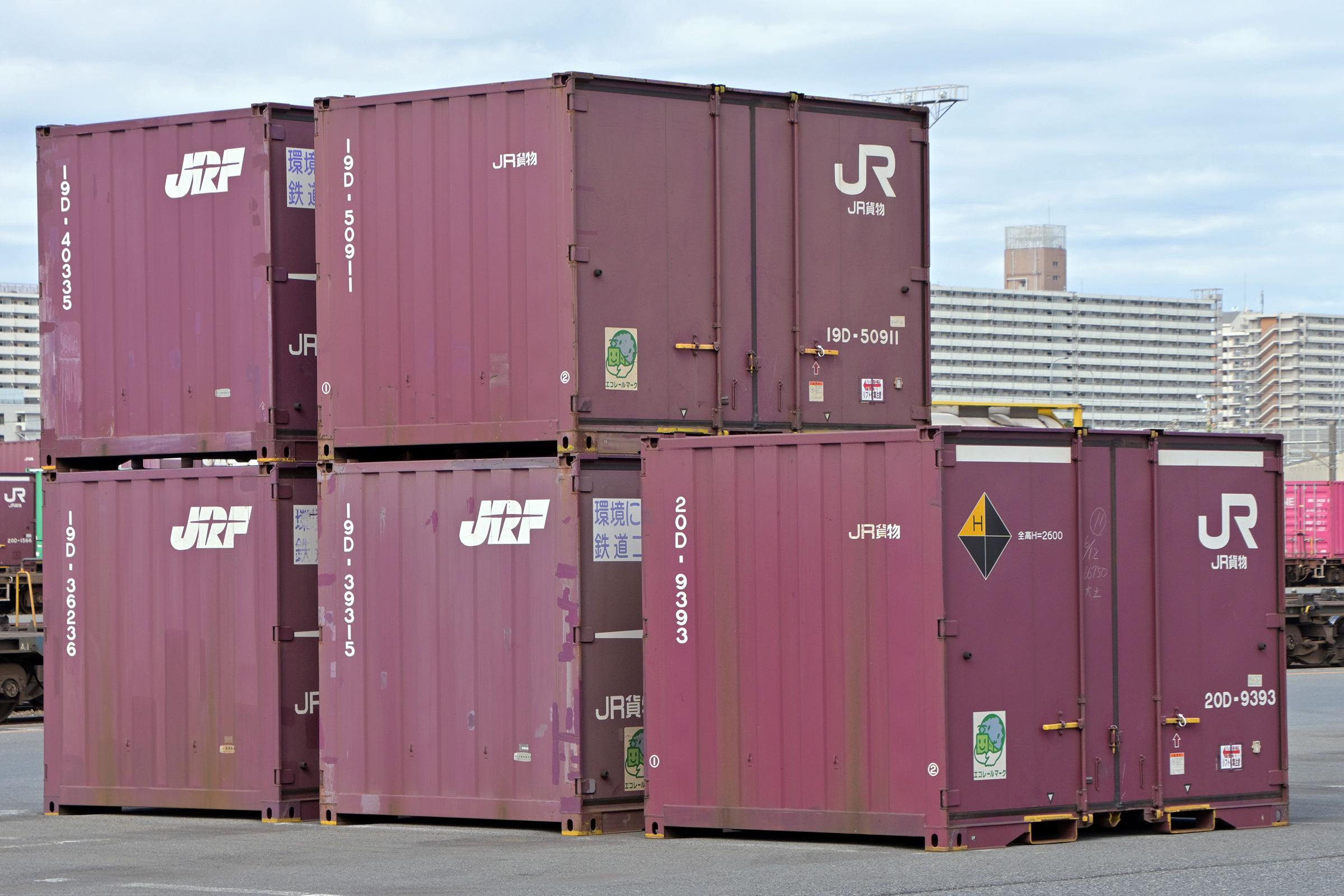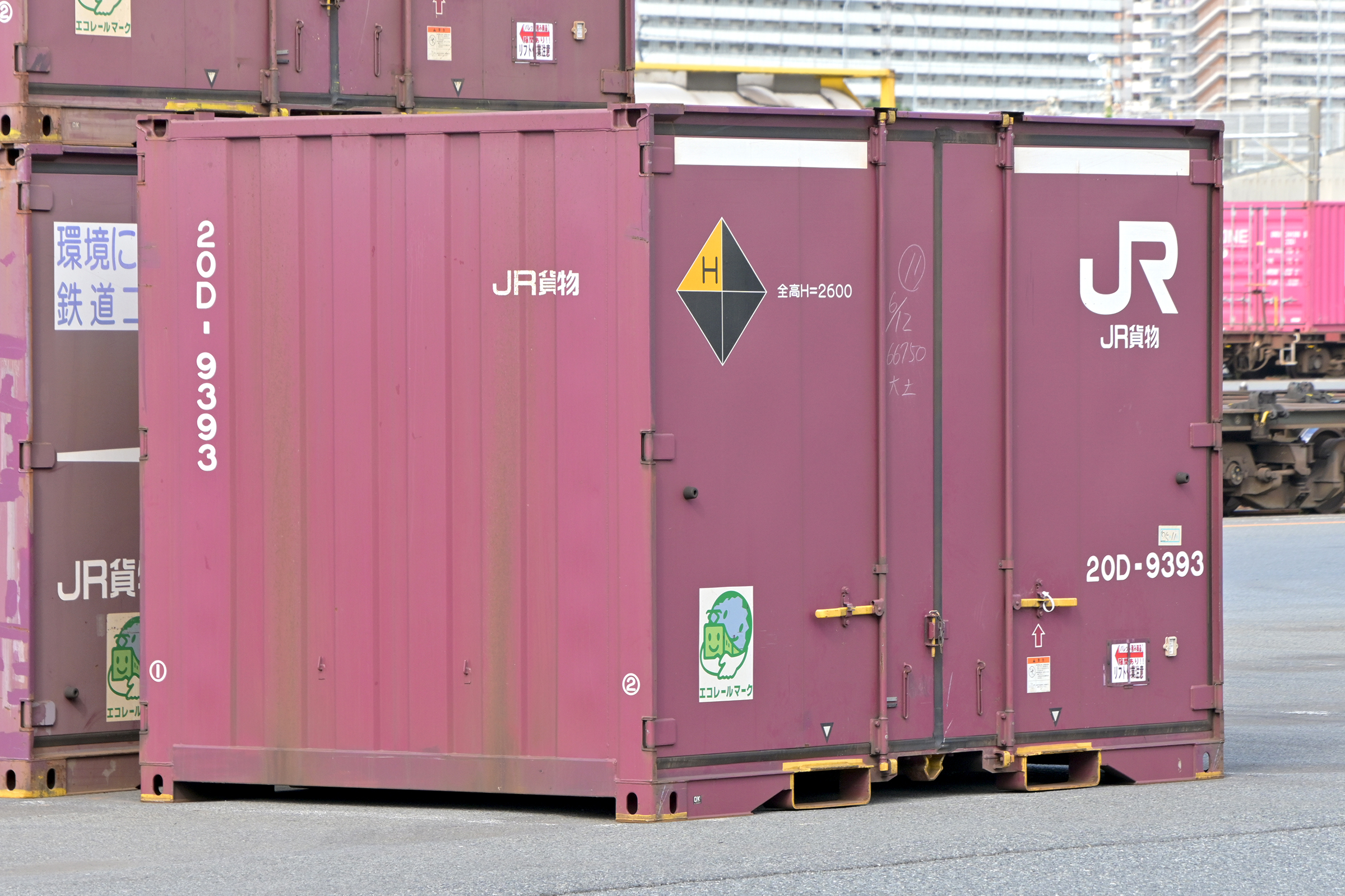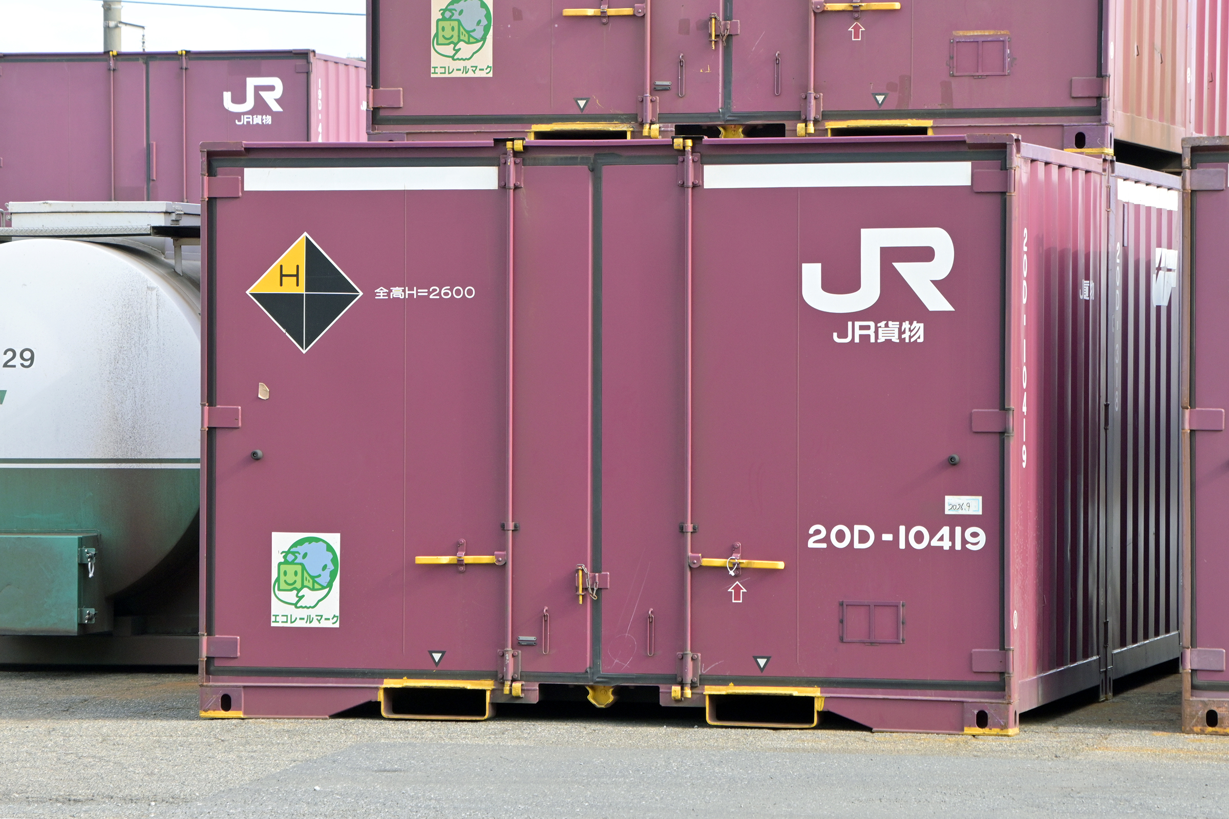 左上のハローマークはJRの標準規格(全ての貨物路線で運用可能)より大きいコンテナに表示、時計回りにW(横幅)H(高さ)L(長さ)G(重量)。