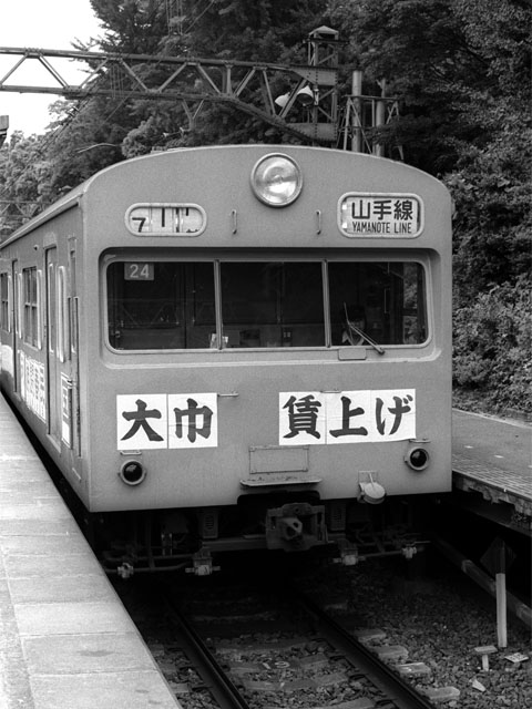 メーデーの余韻なのか、国鉄の労働組合によるスローガンをベタベタ貼られています。 現代人には広告程度に見えるでしょうが手書きの紙なので、お世辞にも奇麗と言えるものではありませんでした。 この車両は改造により運転席下の換気口を塞がれています。 1975/5/14 JNR山手線 原宿 103系0番台Type1 |