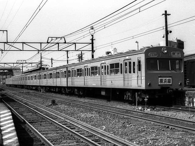 このクハ103-554はスカイブルーで、京浜東北線の蒲田電車区から東神奈川電車区に転属しました。 東神奈川〜磯子では京浜東北線と同色になってしまうため、ドアの上にも横浜線のステッカーが貼られています。 1977/3/26 JNR横浜線 橋本 103系0番台Type1 |