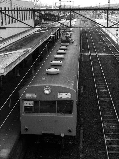 方向幕の整備が間に合わないためか、拝島〜武蔵五日市と書かれたプレートを運転席に掛けています。 整然と屋根に並ぶグローブ形ベンチレーターは、通勤通学用国電の象徴の一つでした。 1977/3/26 JNR五日市線 拝島 103系1000番台 |