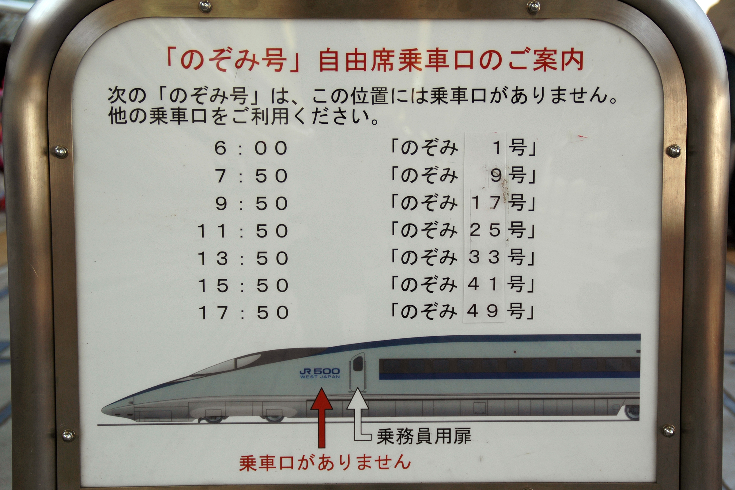 乗客向けの注意書きで500系のために設置されたものです。 2007/6/17 東京駅 16/17番線 |