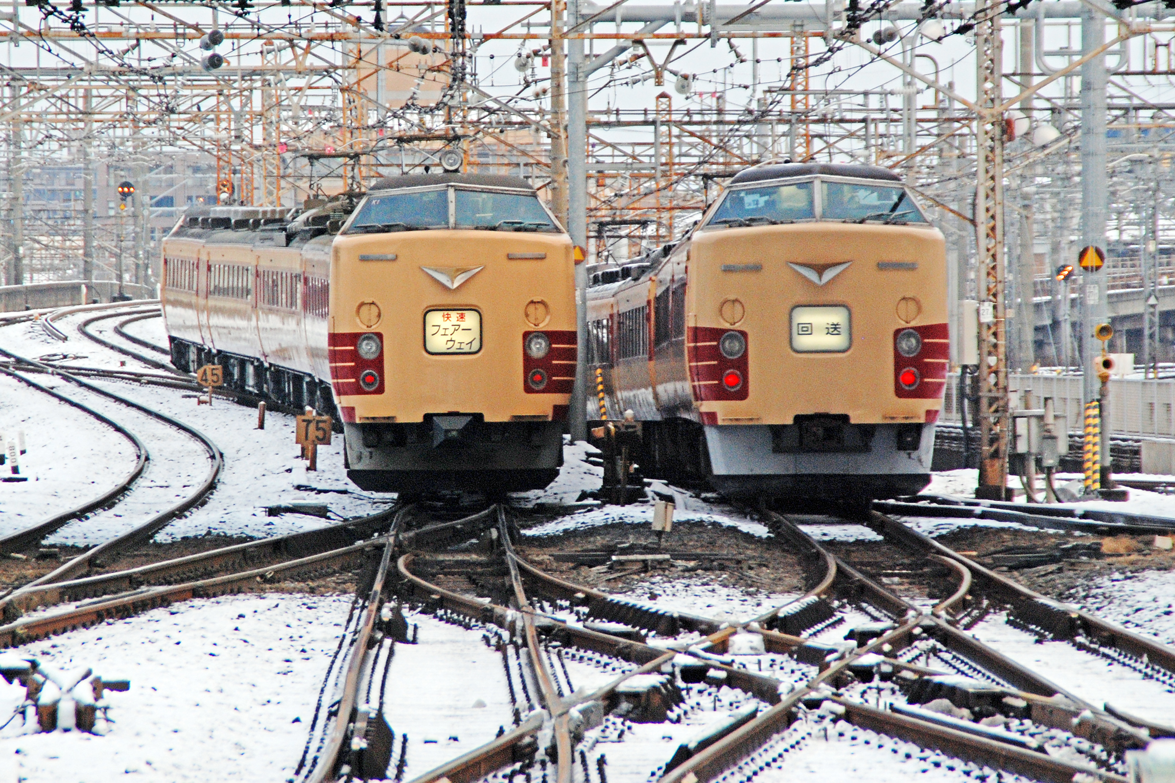11番線から臨時の快速フェアーウェイが発車した直後に、7番線の回送列車が発車しました。 このため全く予期せず国鉄色の485系と183/189系が並走したもので、大宮ならではの光景です。 2008/2/10 07:07 大宮 東北本線 快速フェアーウェイ 485系, 高崎線 回送 183/189系 |