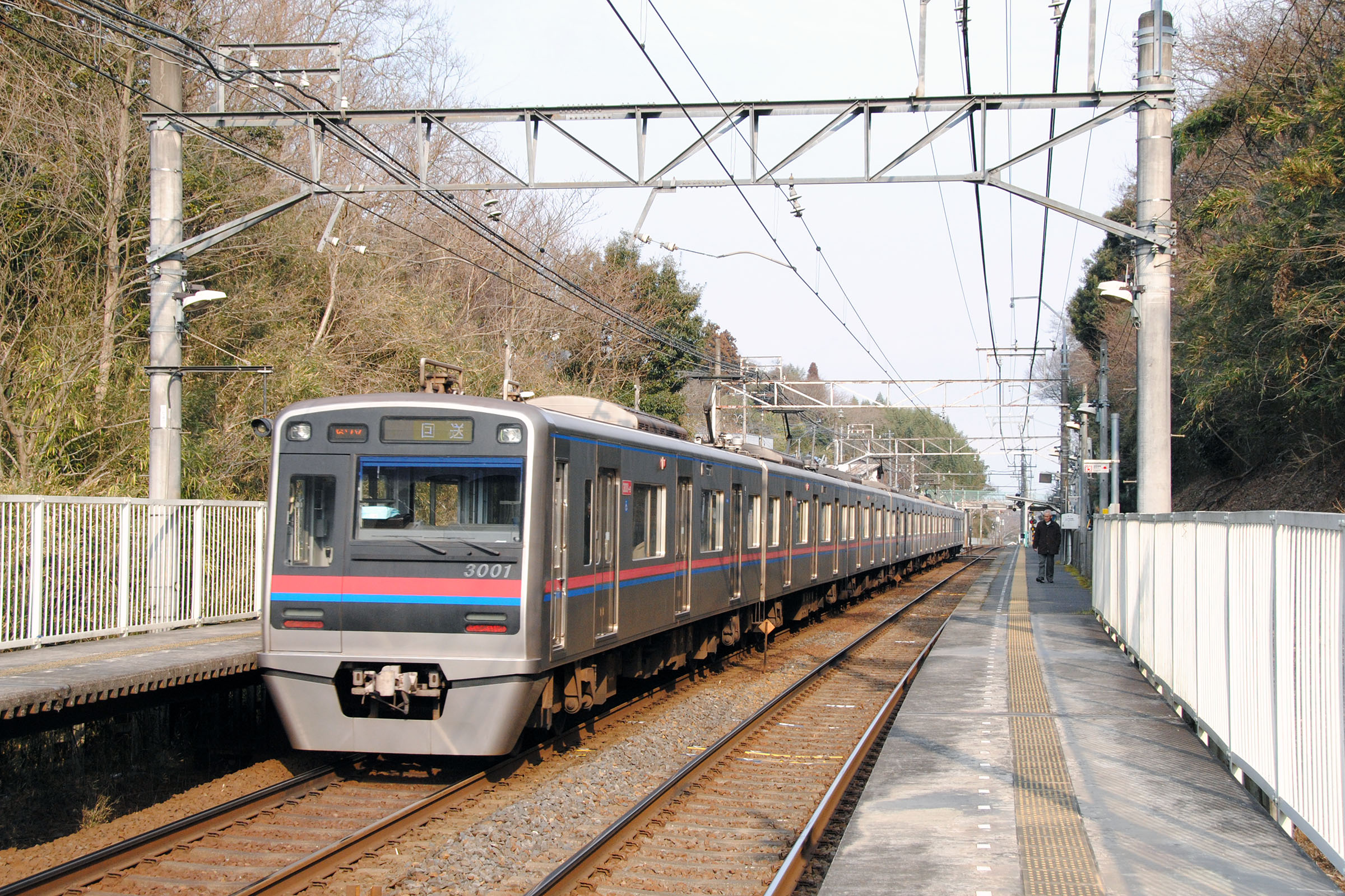 京成臼井を過ぎると直線区間が多く、緩やかなアップダウンを繰り返して登ります。 2010/1/31 本線 大佐倉 model 3000, 3001 回送 |