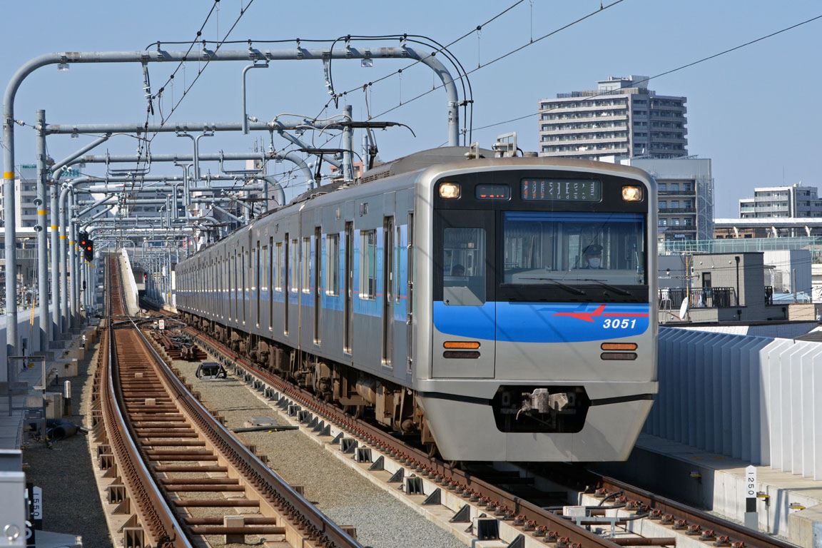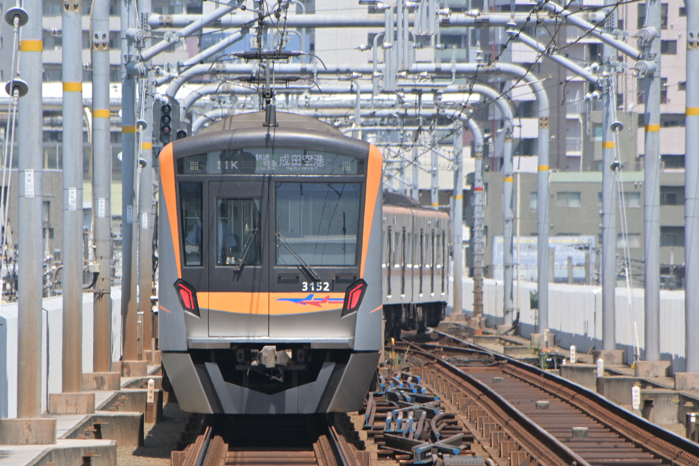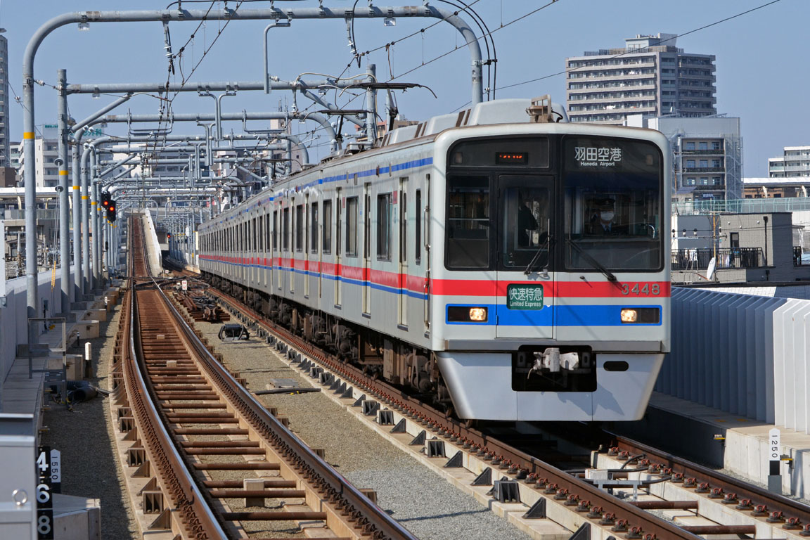 羽田空港から来た上り品川方面行きなので、クロスポイントにより右の4番線に向かっています。 3100のLEDはなぜか尾灯の面積が前照灯より広く、日中も良く見えます。 2025/7/24 京急空港線 糀谷 model 3100, 3152 快特 成田空港行き |