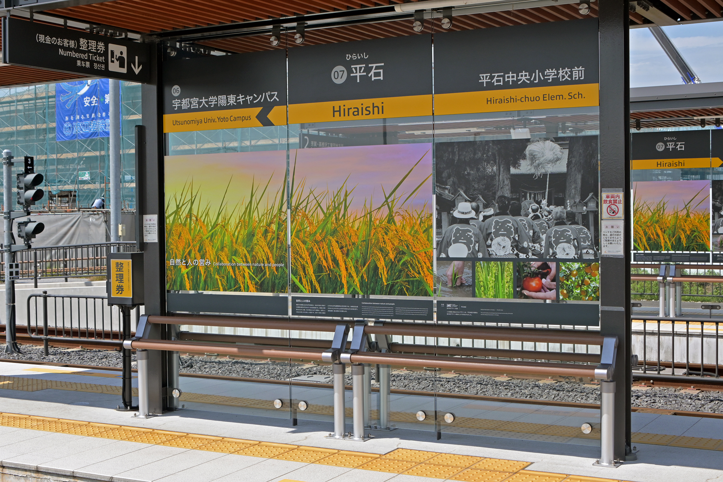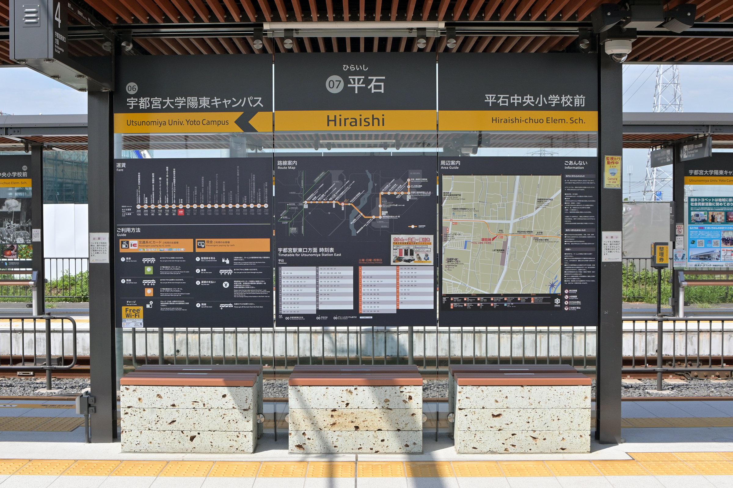 駅名標は上にあり左から次駅、当駅と前駅。 各種情報は下にあり運賃/ご利用方法、路線案内/時刻表と周辺案内/ごあんないです。 宇都宮市では特にニーズがないのか中国語と韓国語はありませんでした。 2025/8/29 平石 宇都宮ライトレール |
