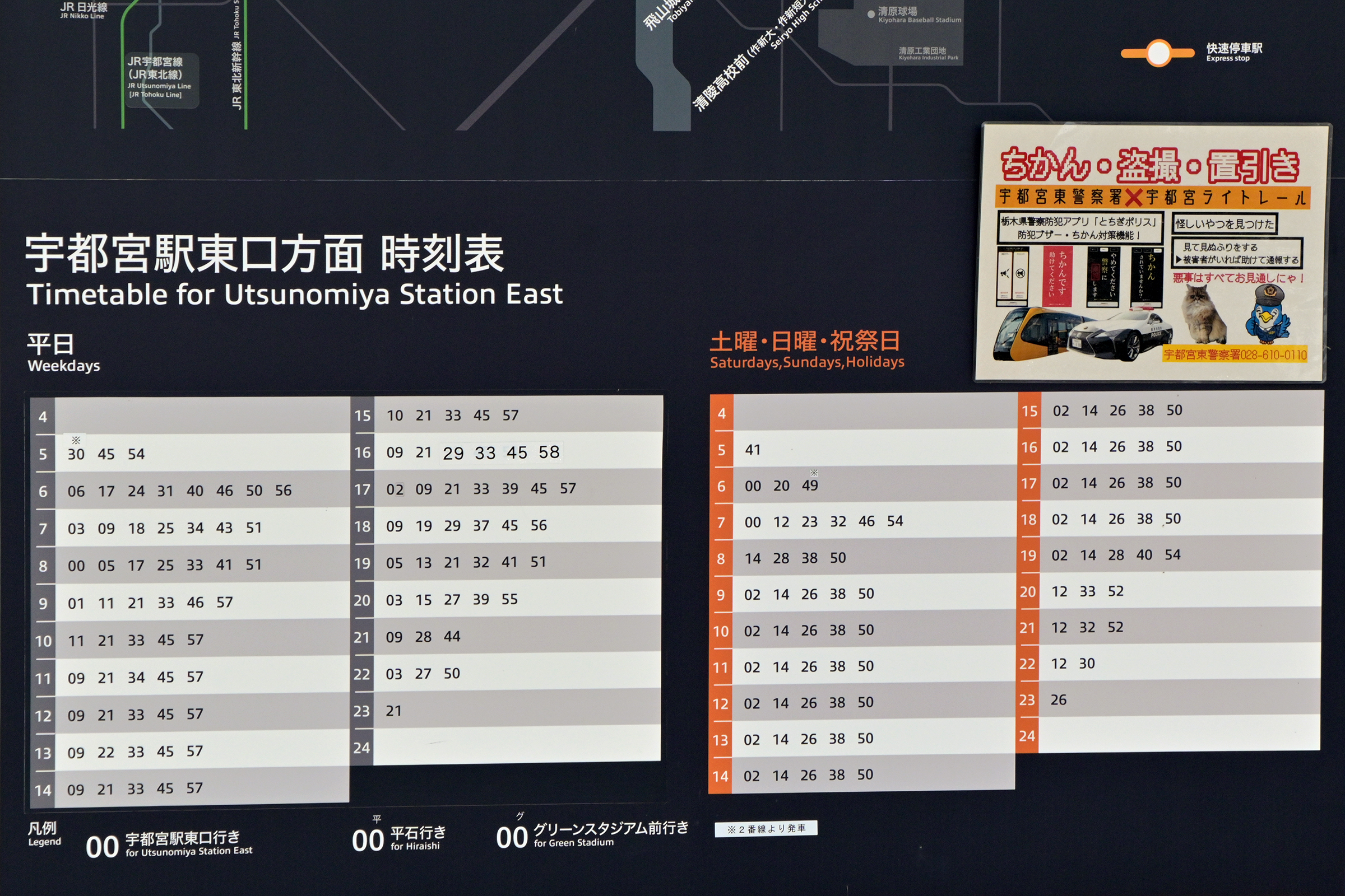 一般的な平日と土休日の2パターンでした。 快速も停車する駅ですが快速の表示がないと思ったら、平日朝の下り2本のみで上り(宇都宮駅東口方面)はありません。 2025/8/29 平石 宇都宮ライトレール |